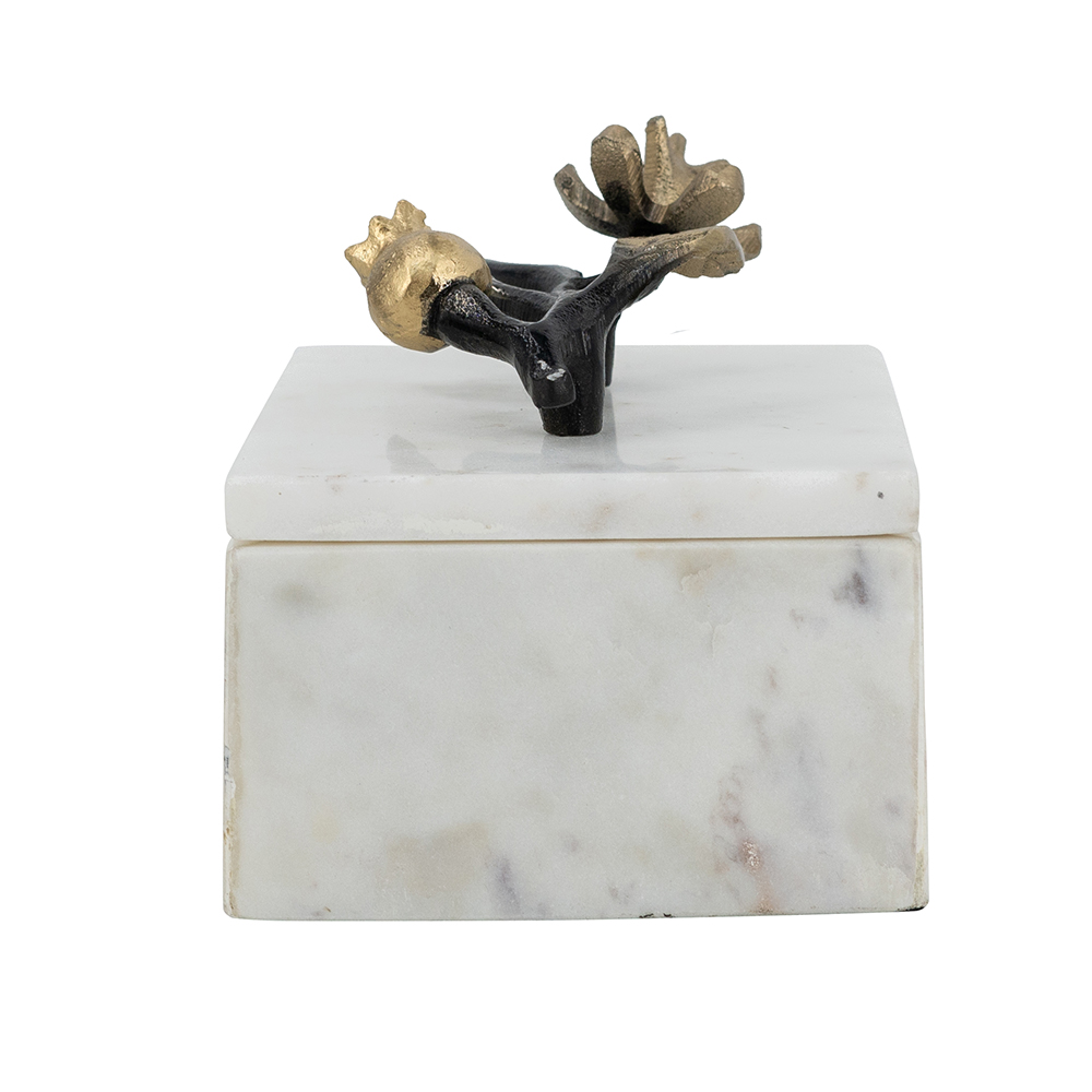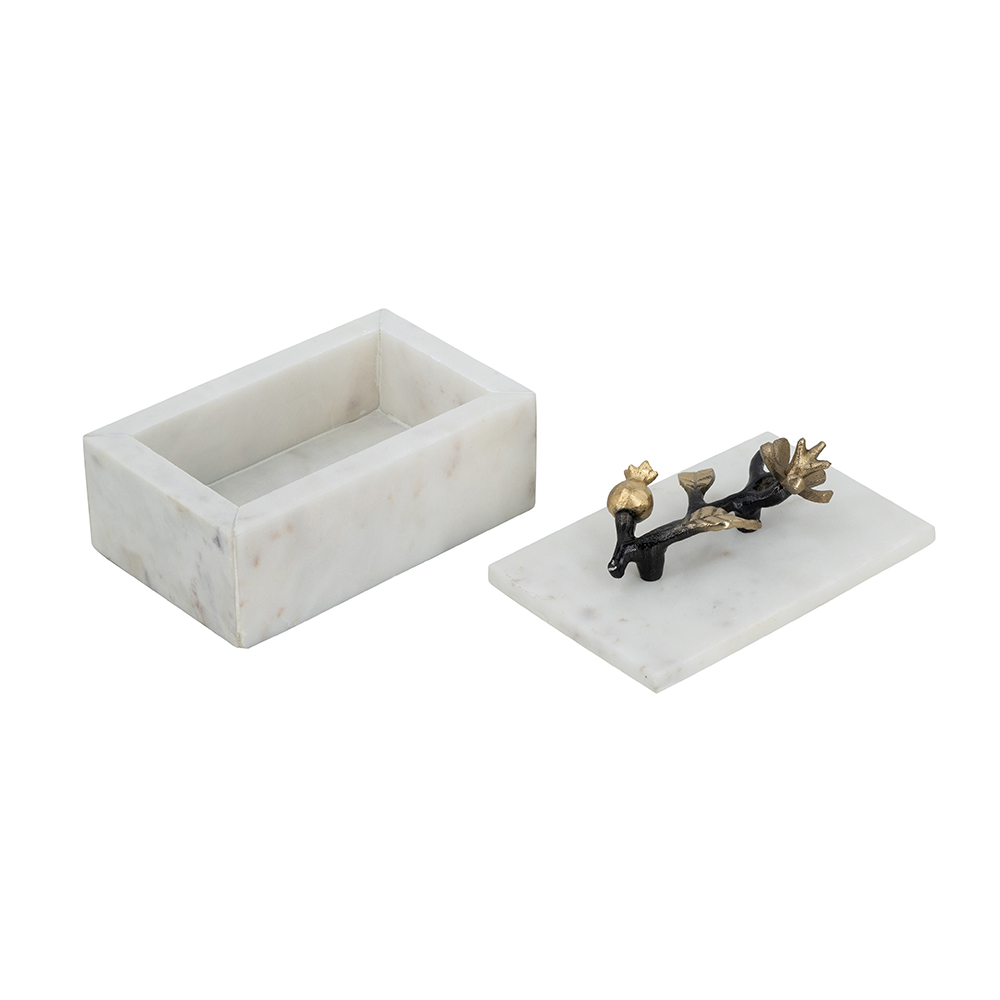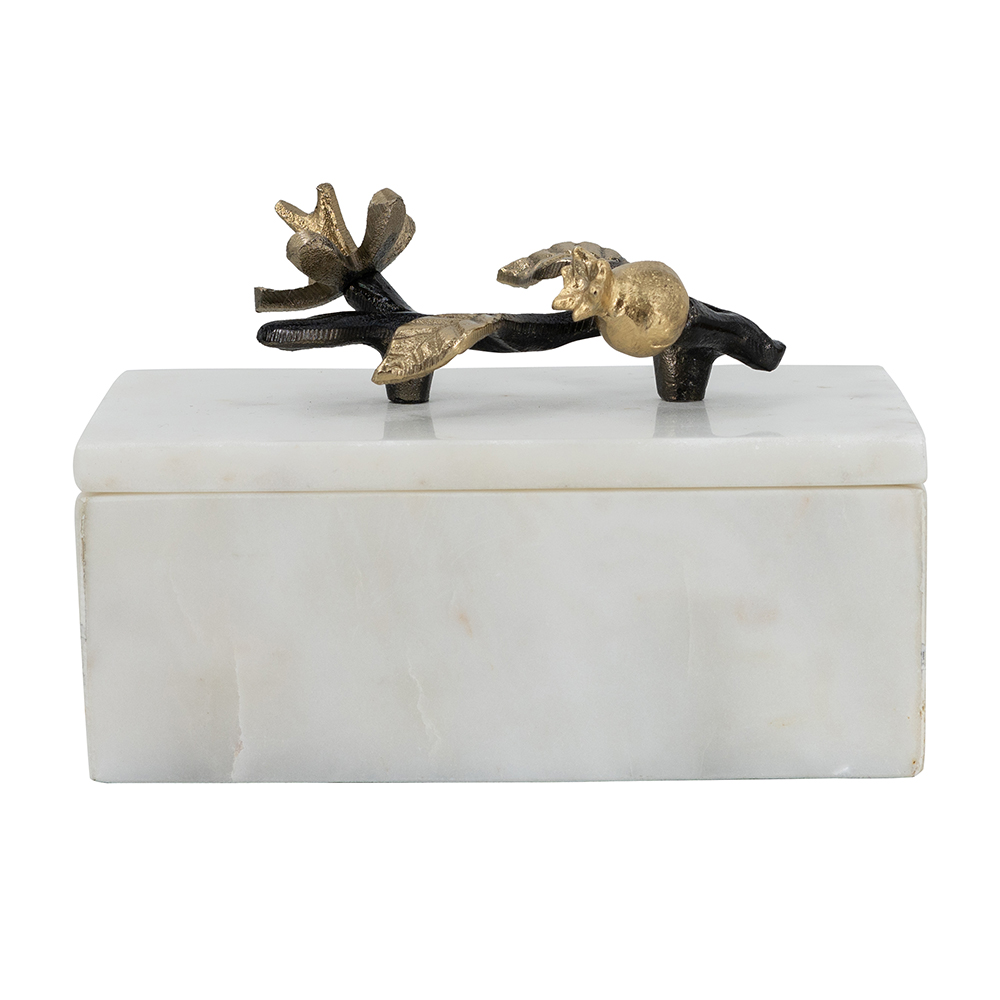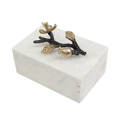 Caja decorativa de marmol color blanco, tapa con tallo negro y flores doradas