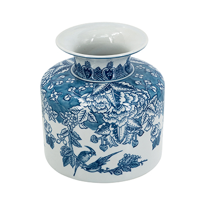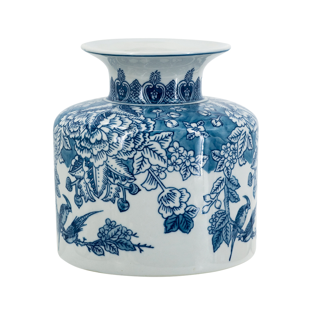 Jarrón con silueta elegante y redondeada, abertura acampanada y delicados motivos florales y aves