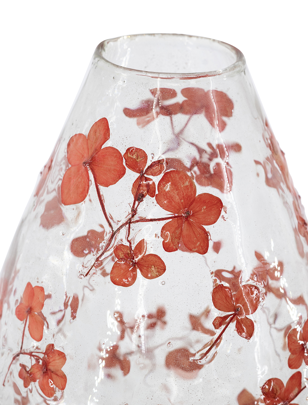 Florero de vidrio con detalles de flores naranjas
