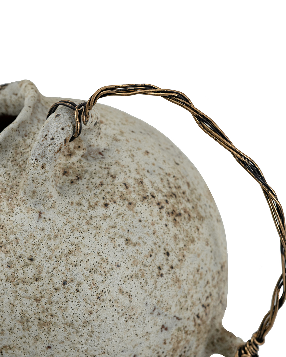 Jarra de ceramica color blanco desgastado con asa de alambre