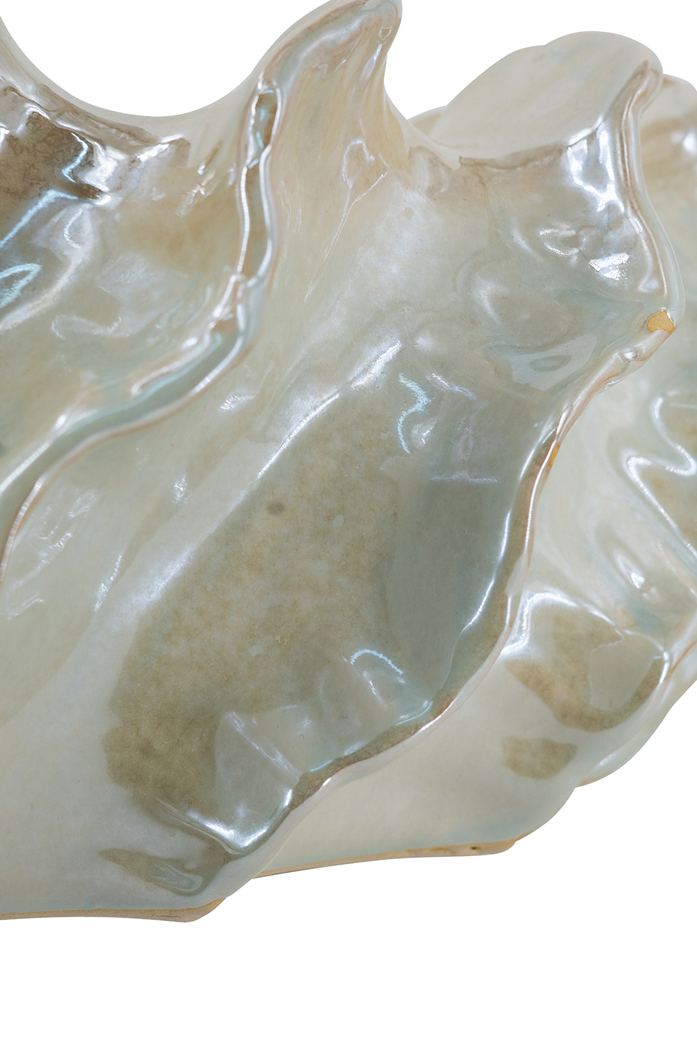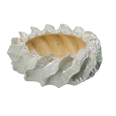 Maceta ancha de ceramica con textura ondulada en color blanco perlado